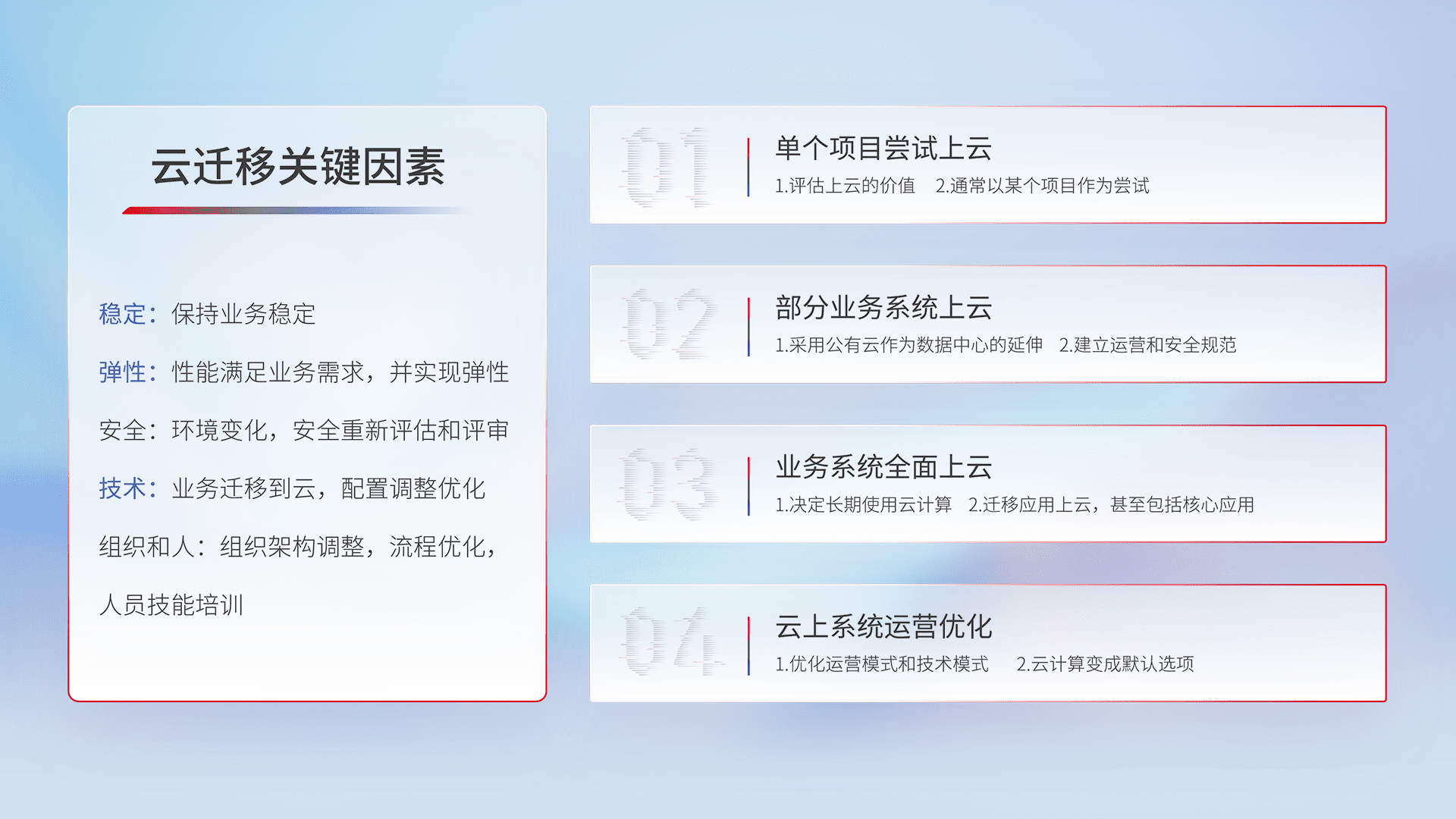 结合实际业务,,,,从规划设计、、云平台选型、、云原生改造、、、数据迁移、、集成交付,,,,迁移全过程为客户识别最佳上云路径,,,,做好风险识别管理,,设计网络架构、、身份权限、、安全审计合规、、操作审计、、、日志审计、、、、监控告警策略、、多站点容灾设计等,,,对云上基础设施进行整体规划,,,提升IT治理水平,,,,以满足弹性、、、高可用、、高性能的需求。。。