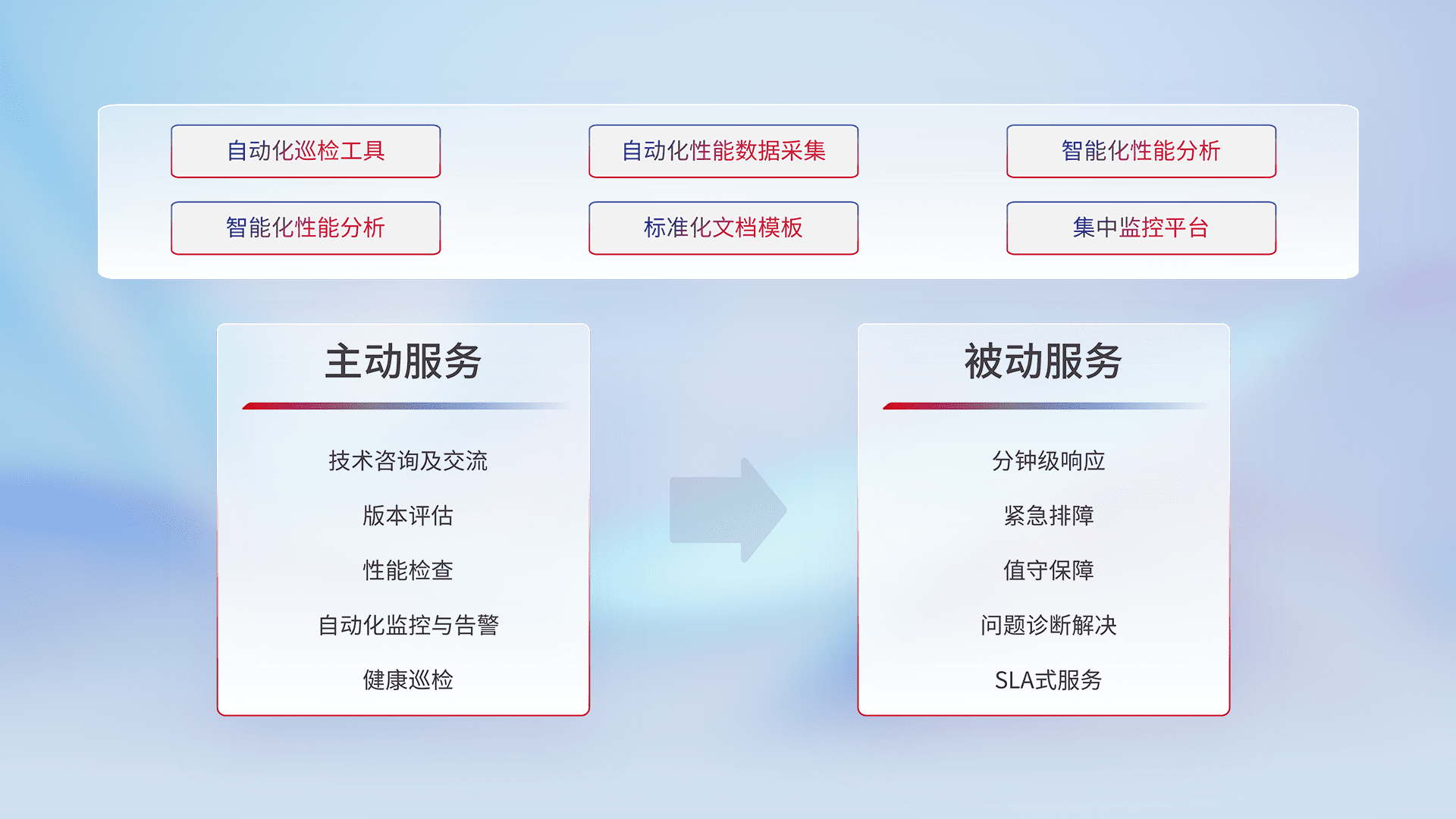 智能化工具和标准化文档,,保障服务质量,,,提供主动服务(包含技术咨询、、版本评估、、、性能检查、、自动化监控与告警、、、健康巡检)和被动服务包含(分钟级响应、、、、紧急排障、、、值守保障、、、、问题诊断解决、、SLA服务)。。
