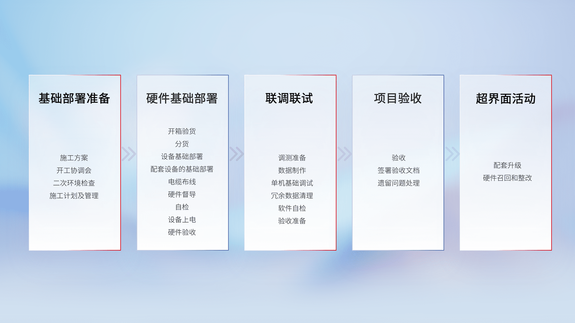 从基础部署准备、、、、硬件基础部署、、、联调联试、、、项目验收、、、、越界面活动的全过程可追溯,,,,保证施工质量和进度。。。。